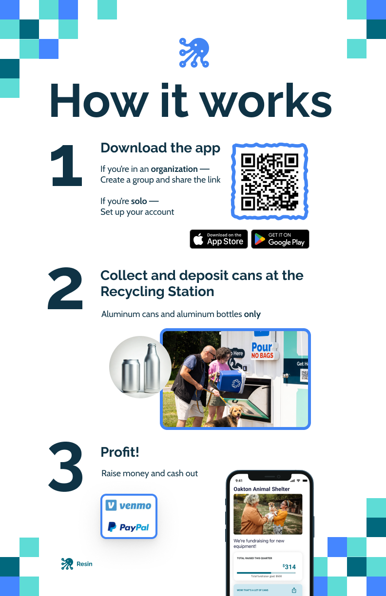 You can donate your recycling rewards automatically by signing up with our code INSERT YOUR FUNDRAISING CODE when you download the Resin app: https://www.resinrecyclables.com/download